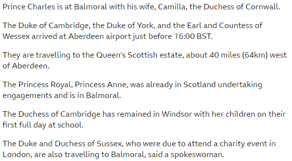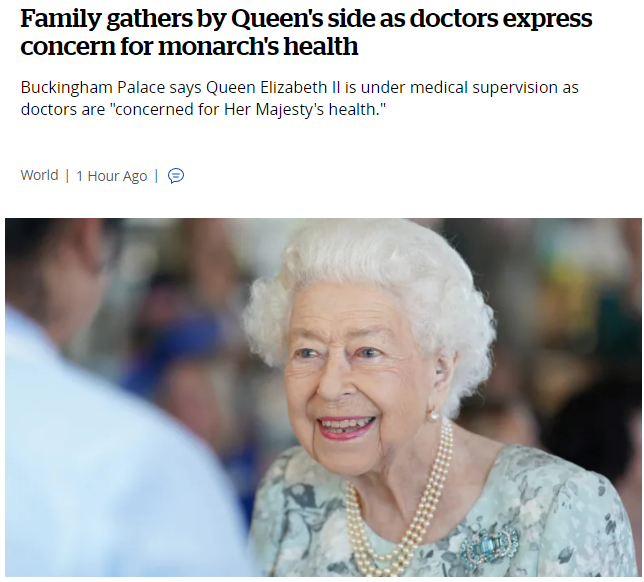 今日早晨,各大新闻媒体包括CBC,CTV,CNN,BBC等都发送了一则突发消息:96岁的伊丽莎白二世女王身体欠佳,进入医疗监护状态。伊丽莎白二世是英国在位时间最长的君主,也是世界上最年长的君主,据白金汉宫说,自去年底以来,女王一直饱受“偶然的行动不便”的困扰。今日,白金汉宫方面称“经过今早的评估,女王的医生非常担心女王陛下的健康,建议她接收医疗监护”。不过发言人在声明中强调“女王目前保持着舒适的状态”。但这并不足以安抚大家,因为白金汉宫发表这样的声明是非常不寻常的——它通常不愿意就这位君主的医疗事务发表评论,这些事务被视为私人事务。目前,查尔斯王子,妹妹安妮公主,和查尔斯王子的妻子卡米拉已守在女王所在的Balmoral城堡,威廉王子和凯特王妃正在赶往Balmoral的路上,哈里王子和梅根,安德鲁王子也都在赶来的路上。其实在本周二(9月6日)女王任命新首相特拉斯时,大家已经猜到了女王可能有健康问题。因为她在任命特拉斯时是在Balmoral城堡进行的,而非白金汉宫,这在过去70年里是闻所未闻的。另外,大家还注意到,女王与特拉斯握手时,右手手背上一片乌青,当时就已经有一些猜测了。另外,今日英国广播公司(BBC)方面出现的一系列后续节目播出变化也很快引起了不少英国人的关注。英国媒体人Scott Bryan就在他的社交账号上发帖称,英国BBC1台已经中断并暂停了截止当天下午6点前所有的常规节目,只为专注播报英女王的情况。同时,他还发帖称BBC1台的新闻主播Huw Edwards在播报女王的健康新闻时打了一个黑色的领带。从他的截图来看,这名主播还穿了一身黑西装,这在不少人看来是“已经做好准备报道相关新闻”。