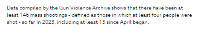 2023年到目前为止,美国至少发生了146起大规模枪击案(4人以上遇难被定义为大规模),就在上上周一(3月27日),美国田纳西州纳什维尔市一小学发生大规模枪击事件。枪手杀害3名9岁儿童和3名教职员工,最后被警方击毙。