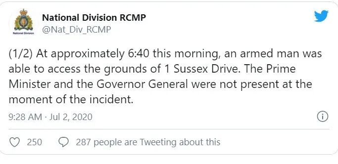 另据CTV报道:皇家骑警推文中说,今晨6时40分左右,一名“武装人员”进入1 Sussex Drive的总督府,他在“未发生任何事件”后被捕,逮捕过程中这名男子没有抵抗。