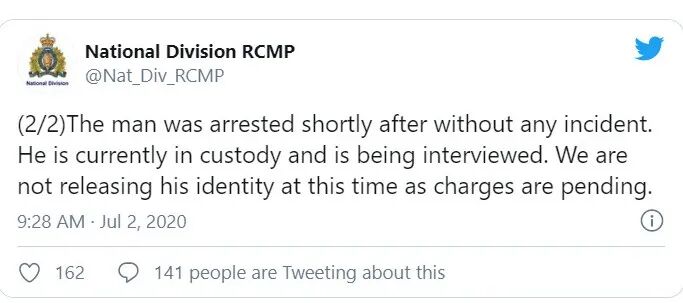 RCMP在更新的推文中说,“他目前被拘留,正在接受问话。该男子面临相关指控,因此现在还不便公开其身份。”皇家骑警确认,事发时加拿大总督Julie Payette并不在住所。总理特鲁多以及家人虽然也住在总督府内,但事发时他们一家人也不在现场。此前渥太华警方也在推特上发布信息,因为警方行动,要求居民在今晨避开总督府 Sussex Drive.附近地区。装甲车都出动了,看起来阵仗很大,因为涉及总督和总理,所以警方必须“大动干戈”,因为谁也不知道这个持枪者是否有后援,是否设置了炸弹等等……