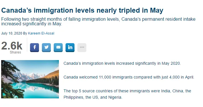 据移民部发布的数据,五月,加拿大迎来了11000名移民,而4月份仅为4000名。这些移民的前五名来源国是印度,中国,菲律宾,美国和尼日利亚。