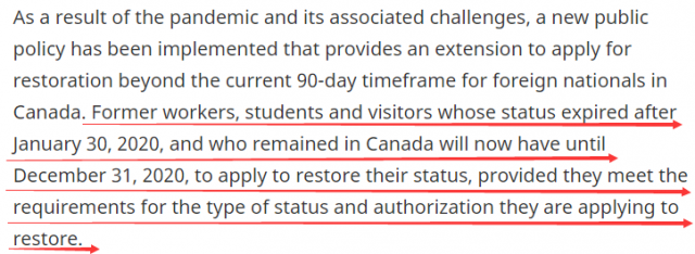 在原来的规定下,这些签证持有人(临时居民)在加拿大境内签证过期后,有90天的时间来向移民部提出签证恢复申请。但是,由于受新冠疫情影响,临时居民无法提供完整的申请信息,以及移民部也无法及时处理这些申请。而且,由于世界各地的航空旅行受到限制,许多临时居民很难找到回国的航班,比如受到“五个一”政策限制的中国人。因此,加拿大移民部实施了一项新的公共政策,延长了适用于加拿大境内外国公民原本要在90天内申请恢复签证的期限。