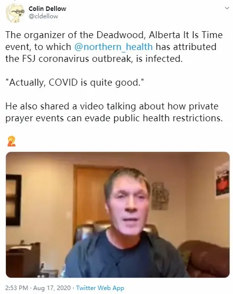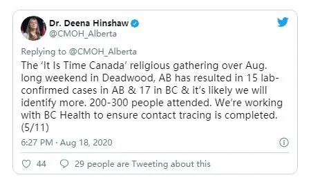 根据阿省首席卫生官Dr. Deena Hinshaw周二发布的推文,8月初长周末在该省Deadwood市举办的一场“It Is Time Canada”宗教活动导致爆发严重疫情。截至目前,已证实32人确诊,其中阿省15例,BC省17例。
