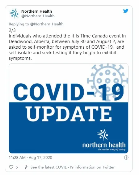 当地卫生局已要求所有在7月30日-8月2日期间参加“It Is Time Canada”宗教集会的人员及其密切接触者进行14天的自我隔离并监测COVID-19症状。据悉,这涉及到大约200-300人。