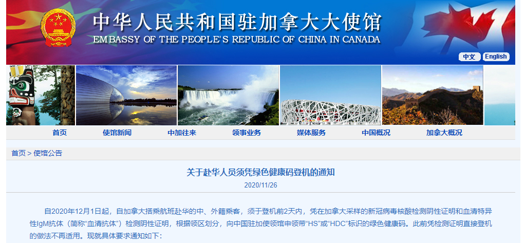 11月26日,中国驻加使领馆分别在官网发出最新通知,详情如下: