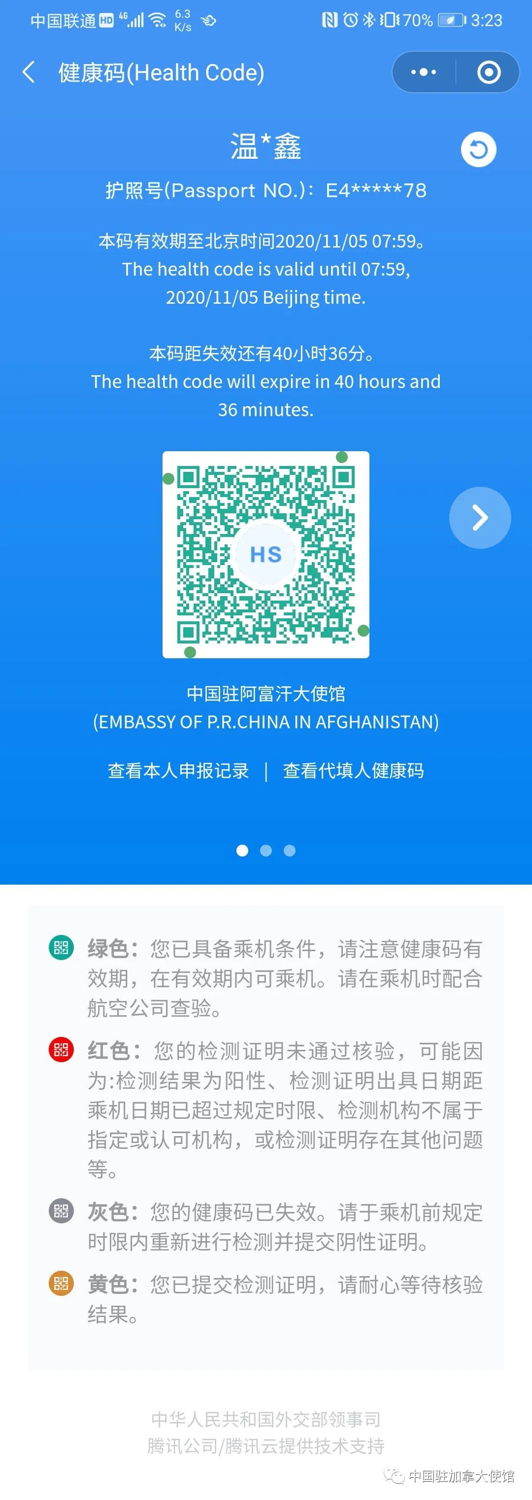 核酸检测和抗体检测,以及申领绿色健康码,都要在乘客登机前2天内在加拿大完成,以采样时间为准。如12月1日接受检测取样,则航班登机时间应不晚于12月3日。反言之,如航班登机时间为12月3日,则取样时间应在12月1日(含)之后。您可以在加拿大卫生部门认可的任何检测点、医院、药房等机构检测。由于各地情况不同,两项检测在同一机构办理或分别在不同机构办理都可以。具体情况请向当地卫生部门了解查询。请务必提前确认检测机构资质和能满足检测时限要求。目前驻加拿大使领馆已确认部分检测机构(名单见附件1)。(一)直飞赴华旅客。从加拿大搭乘直飞航班赴华的人员,包括来加中转乘客,应在登机前2天内在加拿大卫生部门认可的检测机构完成核酸和血清IgM抗体各一次采样、检测。请注意:由于加拿大各机场无法提供检测,请加拿大以外乘客尽可能不到加拿大转机赴华。加拿大仍在实施入境限制措施,存在因转机产生的滞留、遣返等风险.(二)前往第三国中转赴华旅客。考虑到很多国家的中转机场不具备检测条件,为避免滞留中转地,减少旅途感染风险,驻加使领馆原则上不为自加拿大出发、经第三国中转赴华的乘客核发绿色健康码。请大家选择直飞航班赴华。 中国公民应在获得核酸检测阴性证明和血清IgM抗体检测阴性证明后,即通过扫描防疫健康码国际版微信小程序二维码(见附件2),选择检测机构所在领区,申报个人情况并上传核酸检测阴性证明和血清IgM抗体检测阴性证明,两份证明缺一不可!经中国驻加使领馆复核通过后,当事人可获得带“HS”标识的绿色健康码(式样见附件3)。外国籍乘客应在获得核酸检测阴性证明和血清IgM抗体检测阴性证明后,通过手机扫描防疫健康码国际版微信小程序英文版二维码(见附件4)或者直接访问网页版(https://hrhk.cs.mfa.gov.cn/H5/)。注册并登录后,选择检测机构所在领区,申报个人情况并上传核酸检测阴性证明和血清IgM抗体检测阴性证明,两份证明缺一不可!经中国驻加使领馆复核通过后,当事人可获得带“HDC”标识的绿色健康码(式样见附件5)。(一)航空公司将严格查验,无绿色健康码将不能登机。如伪造检测证明,危害他人或公共卫生健康安全,须依法承担相应的法律责任。(二)请坚持“非必要,不旅行”原则。如确需跨境旅行,请在完成检测采样后,应尽量居家隔离,不要随意外出,不参与各类聚集性活动;如确需外出,务必加强防疫措施。如登机前出现疑似症状,请取消行程,及时检测就医。(三)请尽可能在登机前提前申领健康码。中国驻加使领馆会在收到检测报告后尽快审批健康码,包括周末和节假日。驻加拿大使馆(领区为渥太华地区、新斯科舍省、爱德华王子岛省、纽芬兰及拉布拉多省、努纳武特地区):healthcheckottawa@gmail.comcovidcheckfortravel@gmail.com驻温哥华总领馆(领区为不列颠哥伦比亚省、育空地区):驻卡尔加里总领馆(领区为阿尔伯塔省、萨斯喀彻温省、西北地区):hs@chinaconsulatecalgary.com驻蒙特利尔总领馆(领区为魁北克省、新布伦瑞克省):咨询邮箱:consulate_mtl@mfa.gov.cn附件1:中国驻加拿大使领馆已确认部分检测机构名单(注:此名单将动态调整),请至使领馆网站实时查看。附件4:“防疫健康码国际版”微信小程序英文版二维码