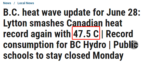 根据加拿大环境部的数据,两天前的周日下午,卑诗利顿 (Lytton) 村以摄氏46.6度的温度打破了加拿大有记录以来的最高气温记录。之前的记录是在1937年7月5日, 萨斯喀彻温省的Yellow Grass和Midale小镇创下了摄氏45度的高温记录。嗯嗯,温哥华人正在经历的,的确是百年不遇的高温天气啊!可是,让人万万想不到的是,我们用接近100年才打破的高温记录,