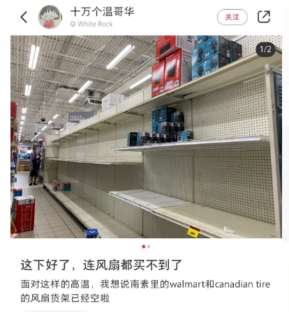 受极端高温天气影响,卑诗低陆平原多个教育局宣布周一停课。与此同时,热浪也迫使一些商家宣布暂时关门谢客,温哥华岛有疫苗的诊所取消预约。热成这样,还是去买台空调吧,可你也别太天真了,现在Costco,Best Buy,London Drugs,Walmart,Home Depot,Canadian Tire等各大商家的空调全都SOLD OUT!一台不知道用了多久的二手空调,居然售价2000刀......面对猝不及防又没完没了的高温天气,无奈的网友们也再度开启了吐槽模式:在阳光炙烤过的阳台,温哥华市民黄先生看到了摄氏56.5度的高温……