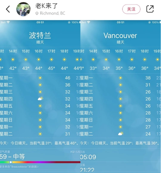 的确。一向温润如玉的温哥华,这几天简直就像是进入了火焰山模式。体感温度直接飙到摄氏50度,不仅比东部的多伦多、蒙特利尔等城市热,甚至比美国南方洛杉矶还要热!这百年不遇的高温热情似火,燃情程度分分钟简直可以把人融化。当然,更悲催的是,很多人家里根本就没有空调、甚至连台电扇也没有,面对大自然如此炙热直白的馈赠,连躲都没法躲,只能生抗……一些居民把门打开通风,没想到大熊趁虚而入,BC省自然保护部门表示,已收到三份熊进入高贵林、北温哥华和西温哥华房屋的报告。这些居民在抗暑的同时,还要抗熊……还有更恐怖的是,气象学家们预测:今后一段时间的天气,还会更加热!!!记忆中的温哥华,6月的平均气温在18度到21度左右,很少会低于15度或超过25度。白天不热,晚上还要盖被子,谁会想起来去买一台用不着的空调?这才是气候宜人的温哥华啊!想当初不知有多少人就是冲着迷人的气候选择了这座城市,可如今在热浪中翻滚,相信很多人一定会别有一番滋味在心头……