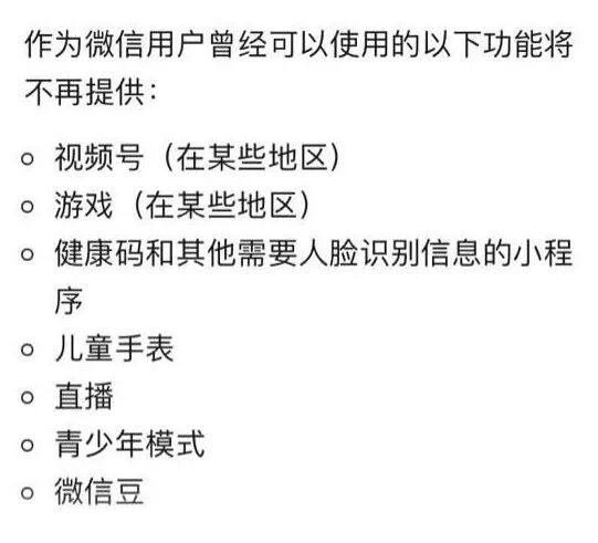 某些地区的视频号,某些地区的游戏,健康码和其他需要人面识别的信息的小程序,直播等。这通知看似是没什么,但是实际对生活造成的影响却非常大!