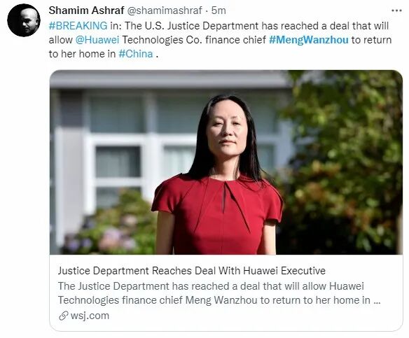 亚洲新闻网记者Shamim Ashraf在推特上援引《华尔街日报》的报道称,美国司法部已经达成协议,允许孟晚舟返回中国。↓↓↓CBC新闻资深记者David Cochrane今日在推特上发文称,如果纽约法庭接受延缓起诉协议,暂停孟晚舟的引渡程序,加拿大检控官将于今天在温哥华出庭。孟晚舟可能最快于今天获释,离开加拿大。推文进一步说,CBC新闻了解到,作为协议的一部分,孟晚舟将会认罪并支付罚款,以推迟指控。↓↓↓(最新消息称,孟晚舟认错未认罪)孟晚舟于2018年12月在温哥华国际机场被捕,美方指控孟晚舟误导汇丰银行有关华为科技在伊朗的商业交易,导致汇丰银行违反美国的制裁措施,美方因此寻求引渡她到美国受审。孟晚舟一直坚称自己无辜,并在加拿大法庭抗争被引渡到美国。目前孟晚舟被限制在温哥华,受到私人保安24小时监控。加拿大法庭关于孟晚舟引渡案的司法听证会已于8月结束,裁决日期定于10月21日。Global News称,解决此案可能会对两名在中国被拘留的加拿大人产生影响。BBC记者Jatinder Sidhu在推特上发言称,孟晚舟可能于今天获释,这将是个大新闻。加拿大外交政策中最头痛的问题将得以解决。