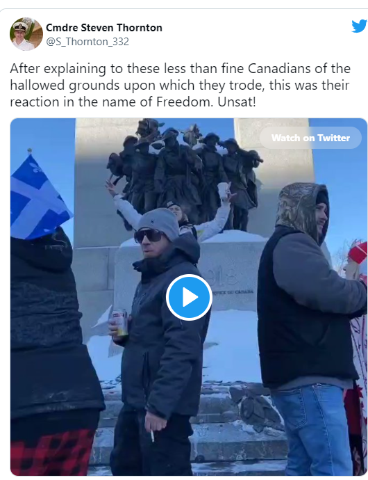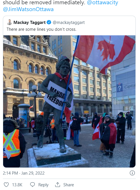 警方于周日表示:“我们已经看到越来越多来自示威者的破坏,和不当行为”。渥太华市中心议员凯瑟琳·麦肯尼(Catherine McKenney)表示:“居民感到非常不安,他们看到了现场的万字符旗帜,邦联旗帜,总理被处私刑的图像”。周六有抗议者爬到国家战争纪念馆的纪念碑,并在无名烈士墓上跳舞。国防部长表示,在渥太华市中心举行的“自由车队”抗议活动中,看到人们在无名战士墓上跳舞的视频让他感到“恶心”。他说:“几代加拿大人为我们的权利而战,包括言论自由,那些参与的人应该羞愧地低下头”。国防部长安妮塔·阿南德称国家战争纪念馆的行为应受谴责。“无名烈士墓和国家战争纪念馆是我们国家的圣地。我敦促所有加拿大人尊敬这里,尊重那些为加拿大而战和牺牲的人”。在加拿大生活的人几乎没有不知道Terry Fox的,然而这个雕像也在此次的抗议活动中被亵渎,在社交媒体上引发了大量加拿大人的愤怒。渥太华市长表示“此举完全不可接受,这种噱头无益于他们的抗议诉求”。