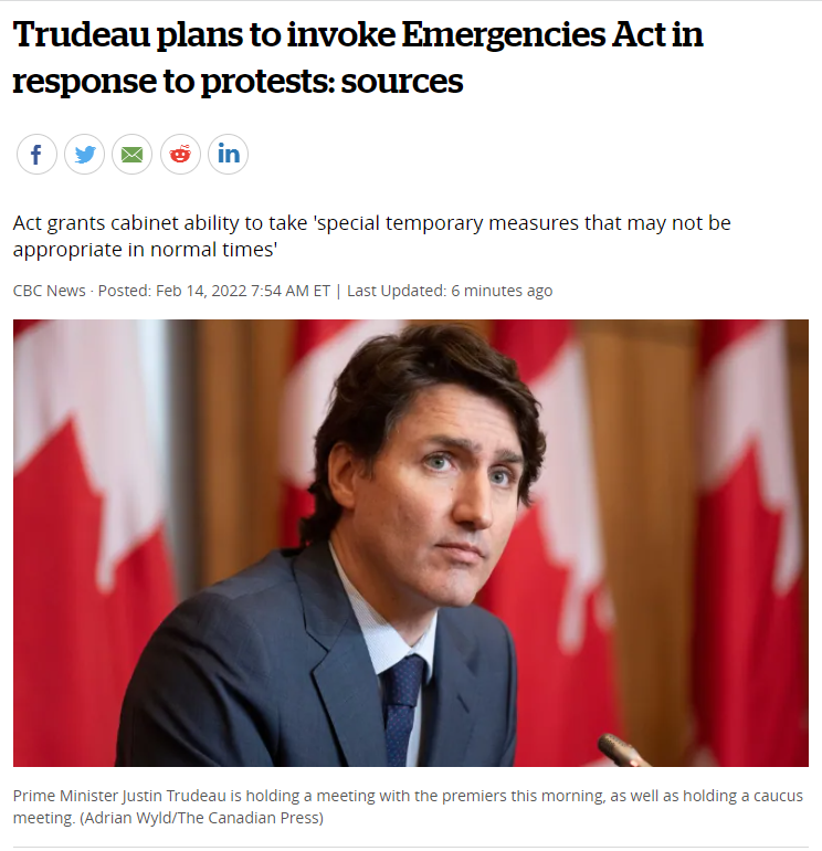 CBC报道,据消息人士透露,“特鲁多总理已经告诉他的核心小组,决定引用之前从未使用过的《紧急情况法》,以赋予联邦政府额外权利,来结束全国各地的抗议活动。”1970年,为应对“十月危机”(FLQ October Crisis),时任总理老特鲁多曾启动紧急法案——《战时措施法》。该法案在1980年时被更名为《紧急情况法》(Emergencies Act)。更名之后,加拿大从未使用过。这位消息人士还说,总理将于今日上午10点召开新闻发布会,向全国通报这一决定。但截止发稿,特鲁多一直没有现身。可以猜想,为了这一决定,特鲁多正在后面忙于辩论、披荆斩棘……