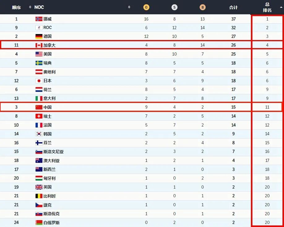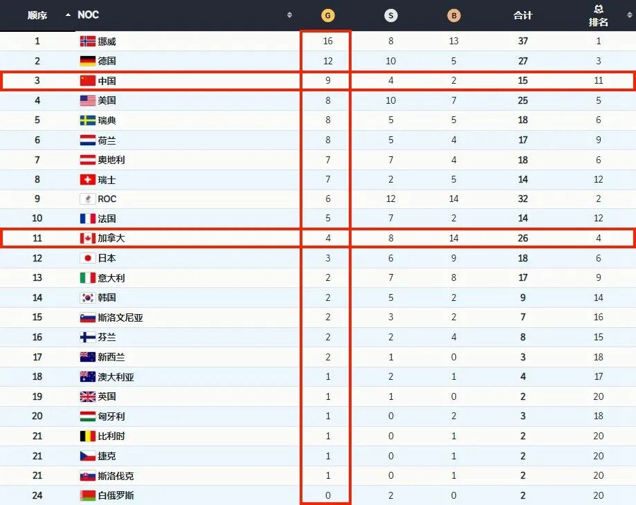 若以金牌总数排行,中国排行第三,加拿大排行第11——这张榜,也正是北京官方公布的“奖牌榜”: