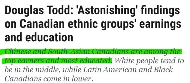 与以往不同的是,新的数据并没有把不同的少数族裔归为一个大群体。细分之下可以看到,每个群体的收入呈现出了惊人的不同。华裔、韩裔、南亚裔,是加拿大收入最高的人群。拉丁美洲和黑人,是最低的。大多白人在工资方面处于中间位置,在大学教育方面处于较低层次。