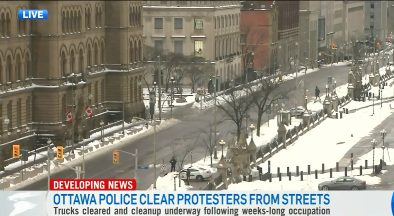 之前,抗议者一直占据在议会周围的区域,直到渥太华警方在周六进行了一系列“围剿”、“清场”。