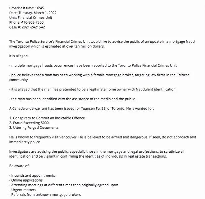一名年仅23岁的多伦多华人男子傅园森(Fu, yuansen)遭到加拿大全境通缉。据悉这名男子。涉嫌多起抵押贷款欺诈案,专门针对华人社区行骗,诈骗金额超过1000万加元。警方称,傅园森随身携带着武器,十分危险!他们建议,一旦发现此人,不要接近他,应立即联系当地警方。警方称傅园森跟一名女性经纪人合作,通过使用虚假身份证明,假装自己是合法房主。然后设立虚构的借贷人和公司,以获得私人抵押贷款。许多受害者的房屋在不知情的情况下,被傅园森用来抵押贷款。想象一下,一位在加拿大打拼了多年的老移民,辛辛苦苦买了自己的房子,结果突然间发现房子平白无故被抵押出去,自己名下还多了一笔上百万的大额债?面临丢房子和信用受损的风险。傅园森的英文名叫Lucas,他在犯案时大都使用这个名字。此人不仅仅在大多伦多地区行骗,还会到处流窜往加拿大其他地方跑…目前,加拿大全境都对傅园森发出了通缉令。他被控一项串谋罪行、一项诈骗罪、及一项伪造文件罪名,这些指控尚未在法庭上得到证实。警方调查人员建议公众,尤其是从事抵押贷款和法律行业的人士,应仔细检查借贷人的身份,尤其是在房地产交易中更要保持警惕,以免再被此类骗局所骗。