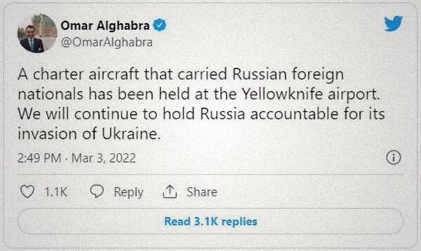 3月3日,加拿大交通部长Omar Alghabra致信Globe News透露此事。同时,他也在自己的推特上公布了这个消息,并表示“加拿大将继续追究俄罗斯入侵乌克兰的责任”。