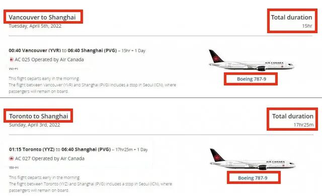 波音787-9的容量要比之前使用的波音777-300ER机型小很多,只有30个商务座、21个超级经济座,以及247个经济座。相比之下,商务座比之前少了10个、超级经济座少了3个,经济座位少了89个。知情人士透露,“更换机型的最主要目的是为了保证燃料供应,控制燃油消耗。因为现在不能飞越俄领空,所以飞机只能绕远,燃油消耗变大。”对有计划回国的华人们,疫情期间的机票原本就已难买,而俄罗斯领空关闭更是“雪上加霜”。现在的机票,不是被瞬间抢空,就是票价翻番到难以想象。据查,现在加航AC25(温哥华-上海)和AC27(多伦多-上海)的经济舱基础票已普遍升至$4,000加元以上......但可怕的是,未来两个月的“经济舱”机票已全部售罄。如果想近期回国,你只能去买“超级经济舱或者商务舱”……以AC27(多伦多直飞上海)为例,4月直飞经济舱机票已经没了,超级经济舱单程$5,750加元(税后约合¥32,229人民币)——这价格,比去年9月最低价时翻了一倍不止.....
