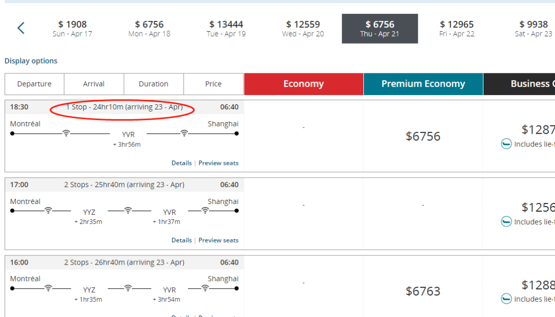 蒙特利尔(温哥华转机)飞上海4月份最便宜的,要$6763加币……而飞行时间,竟超过了24小时!↓↓↓