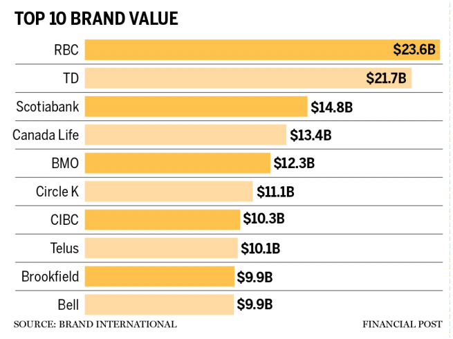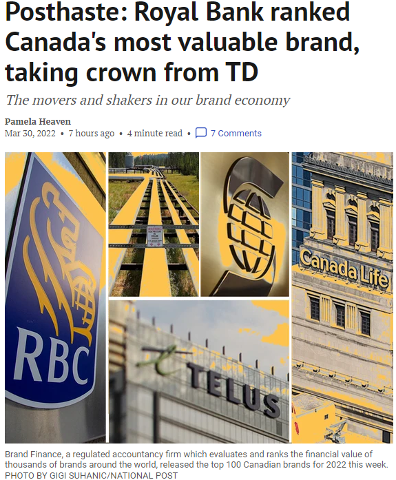 根据总部位于伦敦的brand Finance的调查,加拿大皇家银行(RBC)重新成为加拿大最有价值的品牌。在此前两年,皇银屈居第二,道明银行(TD)第一。Brand Finance是一家受监管的会计师事务所,评估全球数千个品牌的财务价值。本周,该公司发布了2022年加拿大市值品牌100强榜单。第一名,皇家银行是加拿大最大的银行,其品牌价值增长了13%,达到235亿元,主要是得益于其在美国的财富管理业务。第二名,支持大型传统零售银行业务的道明银行,其品牌价值增长放缓至仅3%,至217亿元。第三名,丰业银行(Scotiabank)。Brand Finance表示:“它的历年排行相差不大,甚至没有变化,这样的位置相当令人担忧,该品牌似乎陷入了一种停滞状态。”第四名,Canada Life是一个成功重塑品牌的例子,它是有此榜单以来首个闯进前五名的保险品牌。2019年,Great West Life、伦敦人寿(London Life)和加拿大人寿(Canada Life)合并为“Canada Life”,其品牌价值猛增了150%。BMO排名第五。报告称,“维持系统”以及“银行分支机构的成本”,正在影响加拿大六大银行提供更灵活的现代银行服务能力。