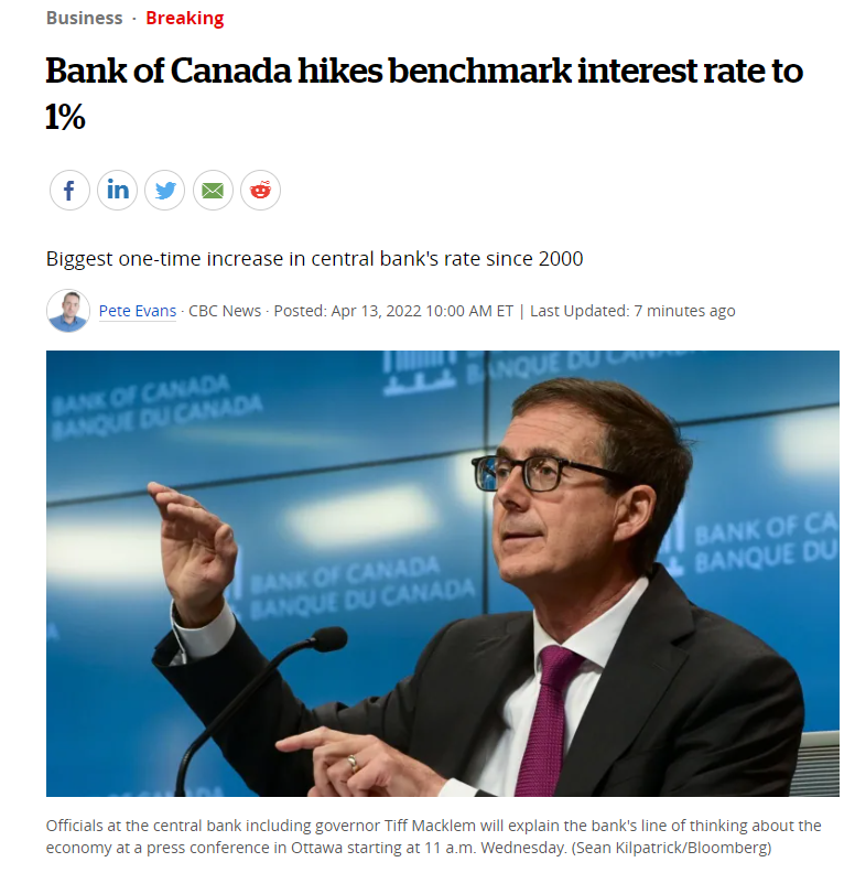 加拿大央行行长Tiff Macklem刚刚宣布将基准利率上调0.5%到1%,这是20多年来首次最大规模加息,上次同等规模加息还是在2000年。3月2日,加拿大央行宣布将基准利率上调0.25%至0.5%。