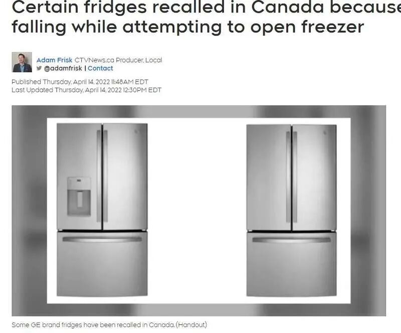 召回产品中,最为常见的是“GE,36英寸(91.5厘米)宽度,底部冷冻型”冰箱,外表为“防指纹不锈钢涂层”。其产品相关序列号以如下前缀开头:DR、FR、GR、HR、LR、MR、RR、SR、TR、VR、ZR、AS、DS、FS、GS、HS、LS、MS。根据加拿大卫生部数据,该款冰箱在加拿大售出2,282件,美国售出155,000件。销售期为“2020年2月至2021年7月”。截至上月底,通用电气(GE)公司已在美国收到37起相关受伤报告,加拿大目前尚无报告。有报道称,美国至少有3人在试图打开此款冰箱下部冷冻柜时,因“把手”脱落而摔倒,并致重伤。