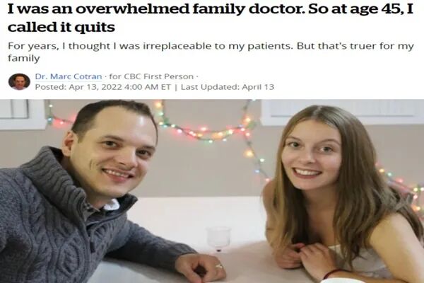 对于加拿大家庭医生Marc Cotran来说,医生确实是一份很神圣的职业,病人在他眼中无可替代。但是,他还是决定放弃这个行业……今年愚人节这天,当他把行医执照上交的那一刻,他感受到了一种从未有过的释然感,“肩头的担子似乎终于卸下来了!”Marc Cotran今年45岁,在许多人眼中,已从医18年的他“前途无量”。然而,Marc却说他“身心俱疲”。在他18年的从医生涯中,Marc亲眼见证了成千上万个家庭的故事,他说离开诊所于他而言,其实是件喜忧参半的事儿。他很庆幸能进入到那么多人的生活之中,为他们缓解痛苦,但同时又觉得自己不堪重负。每次他下班离开诊所的时候,甚至连一句话都说不出来,因为上班时他全心投入,以至于像一只停不下来的陀螺。当他到家时,妻子和孩子均已进入梦乡。他心中满是愧疚,觉得自己完全没有尽到丈夫和父亲的责任。