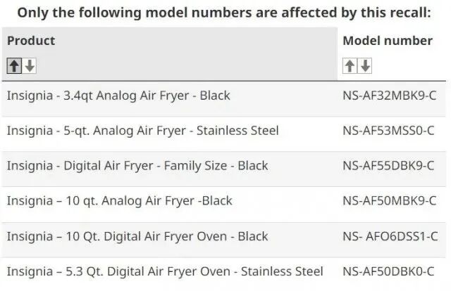 然而,Insignia Digital Air Fryer、Insignia Analog Air Fryers、Insignia Digital Air Fryer Oven三种产品共计六种型号已于近日被证实“存在火灾隐患”。