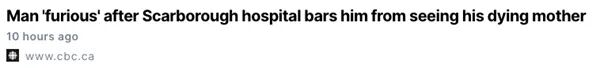 CBC在报道标题中使用了“狂怒(furious)”一词 ↓↓↓今年2月,吴先生年逾七旬的母亲赵女士(Zhao Zhong Ying)入住安省的一家养老院。然而只住了两个星期,2月24日,赵女士突然昏迷不醒。随后,赵女士被送往士嘉堡市的波奇蒙特医院(Birchmount Hospital)进行抢救。吴先生闻讯后立刻赶往医院。然而令他没想到的是,这次探望,竟成“永别”……