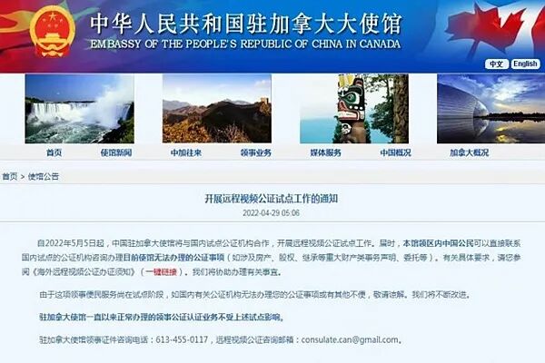 鉴于疫情期间,海外华人在处理国内公证事项时面临诸多不便,4月29日,中华人民共和国驻加拿大大使馆发布了有关“海外远程视频公证办证”的重要通知。“远程视频公证试点工作”将于2022年5月5日正式启动。