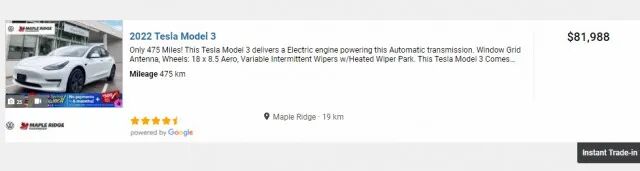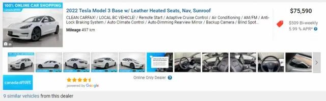 2022年的Model 3,只开了497公里,显然属于准新车,但毕竟是二手的,价格为$75590。而全新的,起价只要$61190!好家伙,二手的比新的还贵1.4万!当然,这里面还有配置不同等细节差异,但是,两者相差的价格还是令人惊讶。