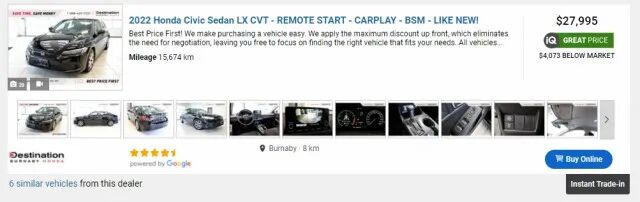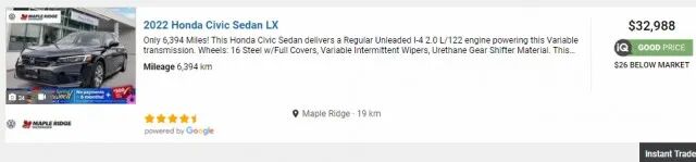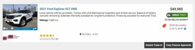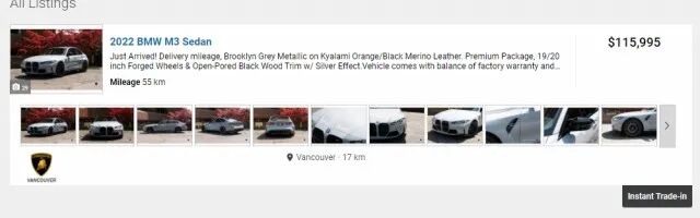 再看这辆里程数为6000公里的RX350,$66995的售价也已超过原价。这辆RX350,$62028的售价要比原价低,但里程数为14882公里。这辆中高配的本田思域价格$27995,被网站精选为“最优价格”,里程15674公里。而本田思域新车起价$25000,选配后约为$27000~$28000。这辆2022款思域开了6394公里,属于低里程二手车,但价格直接超出新车数千元。这辆价格够良心……开了1440公里,但价格和新车差不多。看到这里,想买二手车的人恐怕心凉了半截,但转念一想:“在油价高到离谱的时代,大排量的汽油车一定卖得不好,所以,二手价格应该不会太离谱,会成为二手车市场的一股清流”……事实真是这样吗?这是福特大型SUV探险者,开了7445公里的二手车,被网站精选为“最佳价格”:$49985。然而,新车探险者XLT版起步价外加导航等配置的总价,正好是5万不到一点。结论是,大排量汽油车的二手“最佳价格”,和新车价也相差无几。这是宝马跑车M3——按理说,小众车不至于卖得很贵,结果……这辆2022年款、开了仅55公里的准新二手车,价格高达$115995,比新车贵了1万多。没有必要继续往下看了,这就是2022年5月加拿大(主要是大温地区)二手车的市场行情——甭管什么类型的车,甭管里程高低、年份老旧,只要是二手车,就很抢手,新车又没货,想买车、换车的你,心塞不心塞?此外,联邦及各省为新能源车特别制定的“购车退款”,听起来很美,但却被一些经销商“悄悄”加进总价,羊毛出在羊身上,买的没有卖的精……你心塞不心塞?