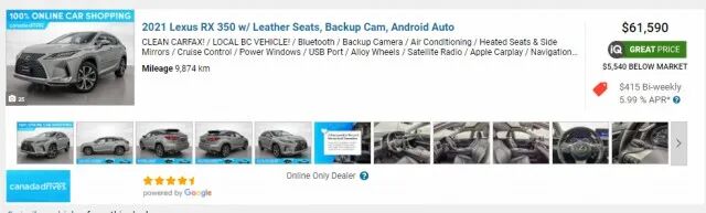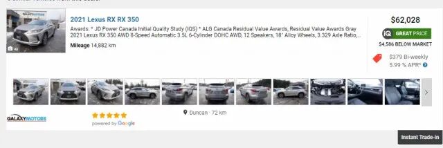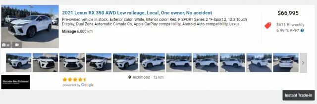 同样车款,开了15000公里,按照常规,该车应已贬值至少20%……然而,它的标价却是$60995,和新车价格只差$195……还有更夸张的,开了475公里的准新车,居然卖到比原价高出$2万!难道你真的等不了8个月,要花8万多去买6万多的车吗?再看特斯拉SUV Model Y,新款价格$82290,这台开了45372公里,本应贬值40%的二手车,竟卖$90843……比新的贵了$8553元。这辆四驱Model 3卖$63958,比新的便宜$7000——看起来,这还是挺有良心的,但你再看里程:74407公里,这谁能接受?最贵的特斯拉Model X,100D2018款当年的价格是12万左右,这辆二手车现在能卖$116984,而且里程数高达77941公里。加价买二手车,这在疫情前听起来非常荒唐,如今却是事实。“汽车”现在已被笑称为“最佳理财产品”。并非只有电动车交车周期长,华人中意的雷克萨斯RX系列,交付日期也要排到10-12个月以后。那么,二手的RX,现在是什么价钱?这辆二手RX350,被Autotrader网站精选为“最有竞争力价格”,里程近1万公里,价格$61590。而此款同样配置的新车价格是$63000左右。虽然“车好,不会太贬值”,一直是雷克萨斯品牌被人认可的著名“标签”,但这样的价钱,若与疫情前的市场相比,仍令人难以置信。