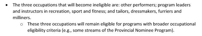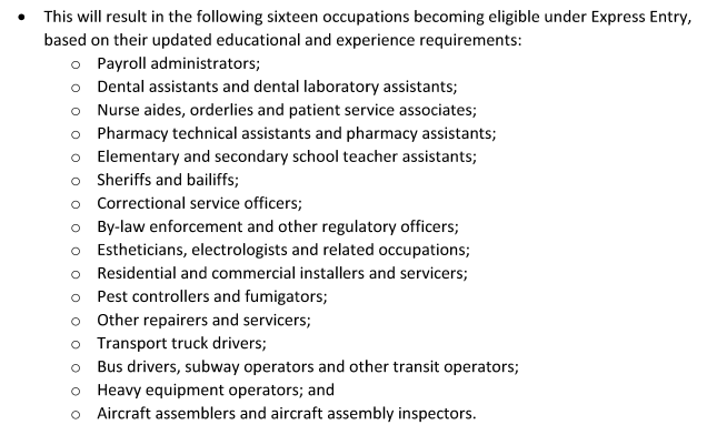 4. 药房技术助理和药房助理(Pharmacy technical assistants and pharmacy assistants)5. 中小学教师助理(Elementary and secondary school teacher assistants)6. 治安官和法警(Sheriffs and bailiffs)7. 惩教服务官(Correctional service officers)8. 市政执法员和其他监管员(By-law enforcement and other regulatory officers)9.美容师、电蚀师和相关职业(Estheticians, electrologists and related occupations)10. 住宅和商业安装员和服务员(Residential and commercial installers and servicers)11. 害虫控制员和薰蒸员(Pest controllers and fumigators)12. 其他维修员和服务员(Other repairers and servicers)13. 运输卡车司机(Transport truck drivers)14. 公交司机、地铁操作员和其他交通操作员(Bus drivers, subway operators and other transit operators)15. 重型设备操作员(Heavy equipment operators; and)16. 飞机装配工和飞机装配检验员(Aircraft assemblers and aircraft assembly inspectors)1. 其他表演者(other performers)2. 娱乐、运动和健身方面的项目负责人和教练(program leaders and instructors in recreation, sport and fitness)