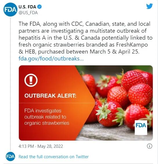 上周末,美国FDA宣布召回草莓,称其或与甲肝感染(A型肝炎)有关。满世界都是新冠与猴痘,谁还在乎甲肝……小编原本不以为然……谁料,此事愈发严重了。