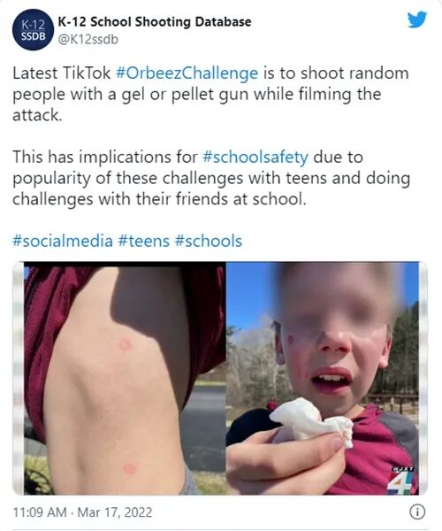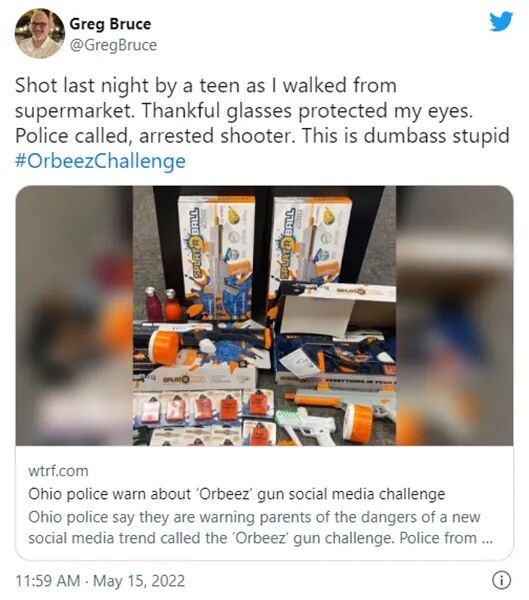 “Orbeez挑战”要求人们使用“Orbeez”凝胶子弹射击路人。该凝胶子弹可以在水中膨胀,从微小的干颗粒变成柔韧的“水珠球”。