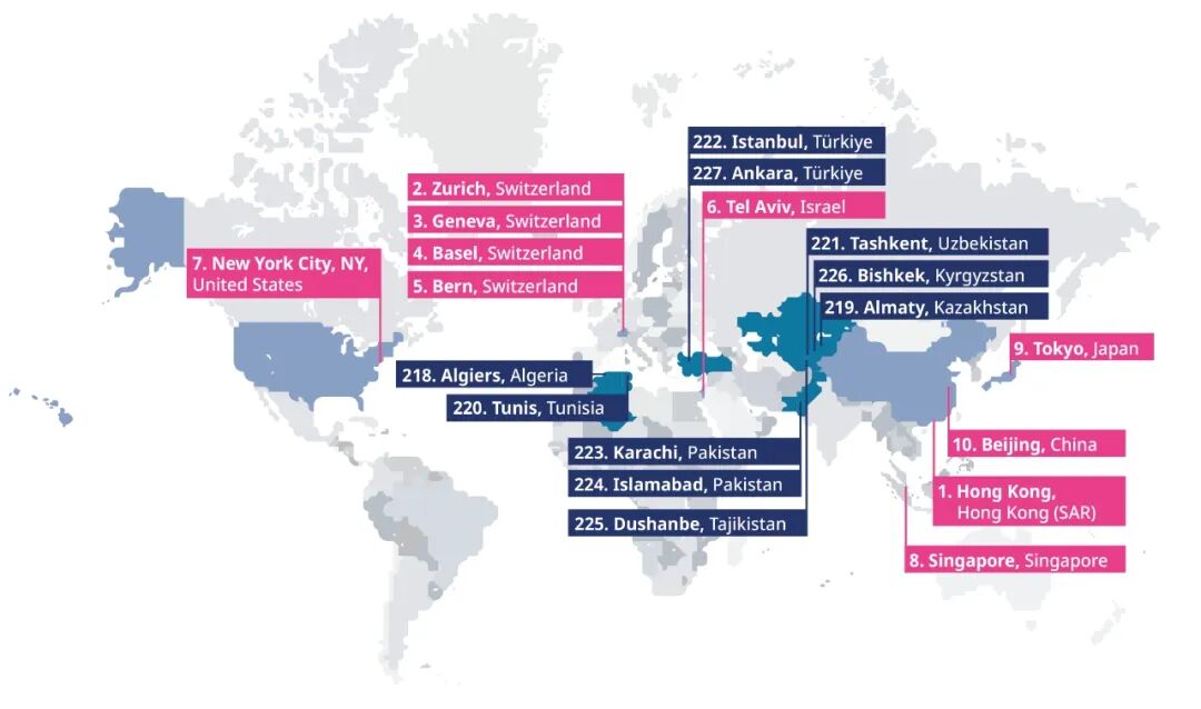 香港在今年的排名中夺冠,其次是瑞士的苏黎世和日内瓦。排名第7的纽约,是唯一进入前十名的北美城市。多伦多,是加拿大最昂贵的城市,在全球最昂贵城市排行中排在第89位,领先温哥华非常多……后者在榜单中排在第108位。蒙特利尔排在第125位,渥太华第132,卡尔加里第141。新加坡第8,东京第9,北京打入TOP10,排在全球第10名。