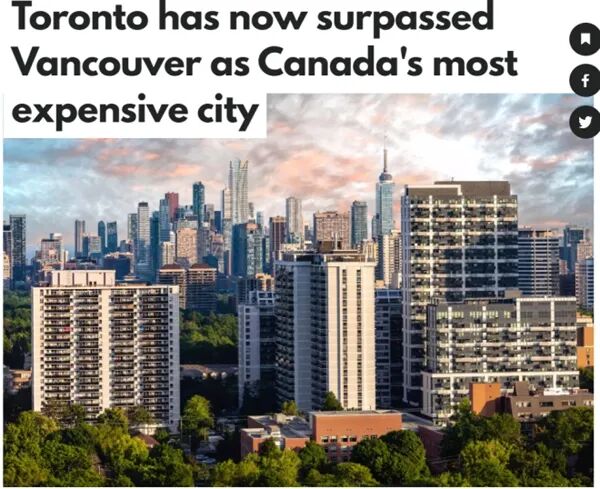 在不久前发布的、更加细分的“北美高生活成本城市指数”排行榜中,密西沙加市竟然排名第二,仅次于纽约市。密西沙加可是大多伦多的一个郊区而已……多伦多市在该榜单上排名第五,将美国城市洛杉矶、圣地亚哥、芝加哥和费城远远甩在身后。截至3月,安省平均住房成本约为平均可支配收入的22.5倍。根据保险和贷款报价网站LowestRates.ca的春季报告,2022年来,租房者平均每月要花费$2067.99元才能交得起租子,而房主则每月平均要花$5417.12元才能供得起房。2021年的一份报告指出,在多伦多市生活,你的时薪至少需要$22.08元(现在只有大约15元……),而激烈且长期的通货膨胀很可能会将这个你已经够不着的数字再度推高。今年,多伦多虽然被“喜提新人”……除了自己涨得太快之外,全球城市“集体飞奔”所导致的水涨船高现象,不容忽视。
