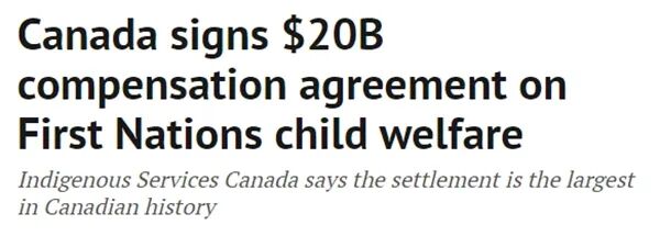 加拿大联邦政府近日签署了一项$200亿加元的和解协议,用以补偿“因儿童福利资金长期不足而受到伤害的原住民儿童及家庭”。据报,这还只是第一步,和解协议的总金额高达$400亿加元……先给$200亿……这个计划被称为“加拿大儿童福利系统改革”:联邦政府将为“与第一民族儿童及家庭有关的服务项目”提供5年资金。据悉,协议中的$200亿元将被用于补偿原住民儿童及其家庭成员,另外$200亿元将专门用于资助与原住民儿童有关的服务。图源:IAN KUCERAK/National Post联邦政府原住民服务部长Patty Hajdu表示,这是加拿大历史上最大的合解协议。“加拿大的决定和行动伤害了原住民儿童、家庭和社区,我相信,如果我们正视所造成的伤害,如果我们能提供补偿,最重要的是,如果我们能永远结束歧视,那么,治愈就是可能的。”第一民族大会曼尼托巴地区负责人Chief Cindy Woodhouse在一份声明中说,她为第一民族儿童及其家庭的这一历史性里程碑感到自豪。据悉,此协议必须在得到加拿大人权法庭和联邦法院的批准后方始生效。