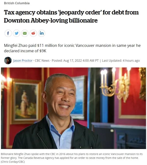 64岁加拿大华裔富豪Ming Fei Zhao(音译:赵明飞)于2014年以$1,100多万加元购入温哥华一处标志性豪宅,但他当年申报的收入仅为$9,424加元。由于赵明飞已离开加拿大前往欧洲,且其正在出售的豪宅是其留在加拿大的唯一资产,加拿大税务局(CRA)于7月申请、并于近日获批联邦法院颁发的“危害令(jeopardy order)”,以期阻止赵明飞出售该豪宅,并可以向他收取所欠债务$770,710加元。CBC报道,该房产是赵明飞于2014年购入的。这座被叫作“Rosemary庄园”的建筑被誉是“温哥华市有史以来最宏伟的住宅”。然而,法院文件显示,赵明飞2014年申报的收入低于$1万加元($9,424加元),2015年为$38,161加元,CRA调查员的结论是“他的年收入不足以支持他购买该房产并支付每月$8,699加元的按揭还款”。CRA反推(重估)赵明飞该两年的总收入,应该为$128万元。因此,其未缴纳的个人收入所得税及附加利息与罚款,应该是$770,710加元。在法律程序上,这意味着CRA在上诉确定之前不能采取具体行动(比如要求赵明飞直接付款)。但联邦所得税法允许CRA出于很难追回欠款的顾虑而向联邦法院申请“危害令”,使用“扣押欠款人财产的方式”强制收回欠款。联邦法院法官Cecily Strickland在颁发“危害令”时表示,赵明飞没有以传统方式处理其事务,导致CRA难以追踪或收回其所欠税款,因此颁下“危害令”以策万全。据悉,CRA提交的法庭文件包括2,000页文件,显示“调查人员一直在试图查明赵明飞的银行账户余额、未报告的全球收入以及其身在何处”。文件显示,在来到加拿大后的一段时间里,赵明飞曾同时拥有过另一座价值数百万加元的房屋,以及一辆宾利、一辆劳斯莱斯、一辆奔驰和一辆路虎揽胜。但是,截至去年6月,于他名下注册的财产只剩“Rosemary”豪宅和一辆路虎揽胜。7月份记录显示,赵明飞已不再拥有加拿大的手机账户。此外,CRA还表示,据调查,两年前,赵明飞便已不在温哥华居住,而在前往欧洲组建了一个新家庭。此外,CRA特别指出,赵明飞的法律代表已明确表示,“没有人会在法院听证会上为赵明飞出庭”,以及“有关物业以$1,998万加元放盘已一年,但无人问津,销售前景并不乐观”。据《环球邮报》报道,2020年,赵明飞在花费$700万加元装修之后将“Rosemar庄园y”挂牌出售,标价为$2700万加元。时至今日,该物业仍未售出,而其挂牌价格已降至$1998万加元。