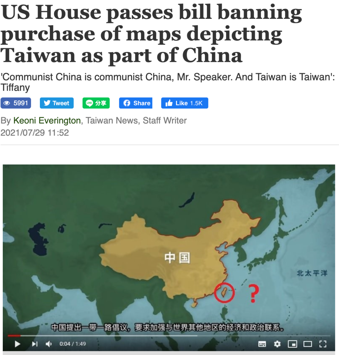 该一揽子法案中的一项修正案引发巨大关注——“禁止美国行政部门花钱制作、采购或展示任何将台湾地区画成中国一部分的地图”。