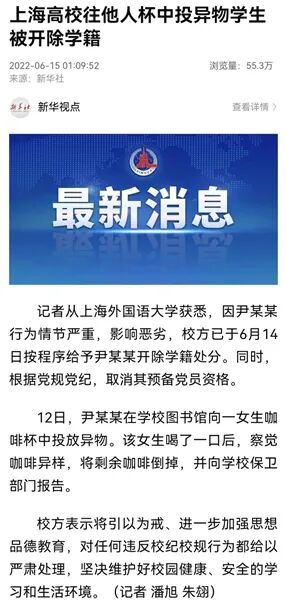 据新华社15日消息,记者从上海外国语大学获悉,因尹某某行为情节严重,影响恶劣,校方于6月14日按程序给予尹某某开除学籍处分。同时,根据党规党纪,取消其预备党员资格。