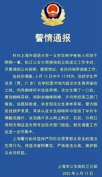 12日,尹某某在学校图书馆向一女生咖啡杯中投放异物。该女生喝了一口后,察觉咖啡异样,将剩余咖啡倒掉,并向学校保卫部门报告。校方表示将引以为戒、进一步加强思想品德教育,对任何违反校纪校规行为都给以严肃处理,坚决维护好校园健康、安全的学习和生活环境。12日,上海外国语大学学生尹某某(男,21岁)在学校图书馆向一女生咖啡杯中投放异物。该女生喝了一口后,察觉咖啡异样,将剩余咖啡倒掉,并向学校保卫部门报告。6月12日晚,上海外国语大学官方微博发布通告称,当日中午,一学生在图书馆自习时,咖啡杯被学生尹某某投放异物。当日下午,涉事学生已被公安机关带走调查。13日,上海市公安局松江分局通报称:经医院检查,未发现该女生身体异常。警方随后找到尹某某,其承认在女生咖啡杯中投放了半片牛磺酸泡腾片,该泡腾片系从网上购买。目前,分局已将相关物证送市局专业技术部门检验,相关调查工作在进一步开展中。据中新财经报道,13日晚间,记者浏览电商平台发现,目前多数以低俗色情内容为封面宣传的牛磺酸泡腾片已在多家电商平台被下架。多家商家表示,该泡腾片是运动饮料,主要成分是维生素,并没有其它作用。不过,也有商家在中新财经咨询时称牛磺酸泡腾片为“女用植物饮料”,并以低俗内容为噱头向记者推销,然后将该消息撤回。此外,据红星资本局报道,记者注意到,在电商平台存在大量将牛磺酸泡腾片包装成“女性春药”的产品,在上外学生投放牛磺酸泡腾片事件发生后,多商家紧急下架相关产品。与此同时,公众将“春药”、“迷药”等与牛磺酸联系起来,但事实上,牛磺酸并非所谓的“春药”,而是食品添加剂中的营养强化剂,目前广泛应用于食品、饮料、医药等行业。6月14日,牛磺酸巨头永安药业(002365.SZ)对红星资本局表示,公司目前并未有产品的效能涉及提高女性功能。