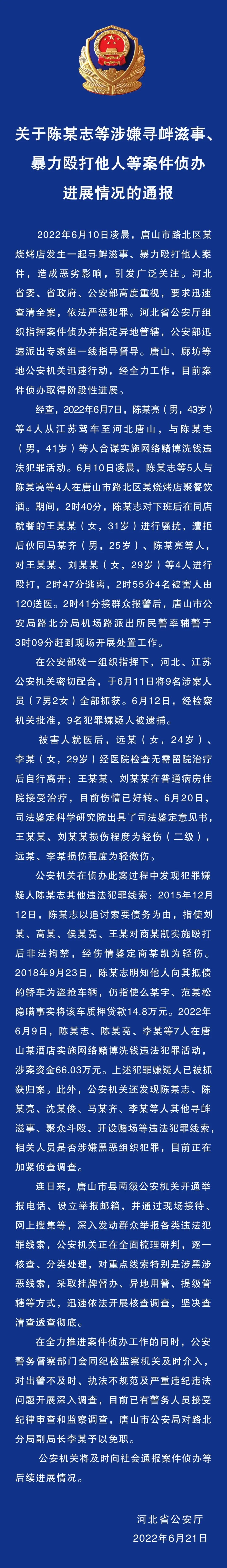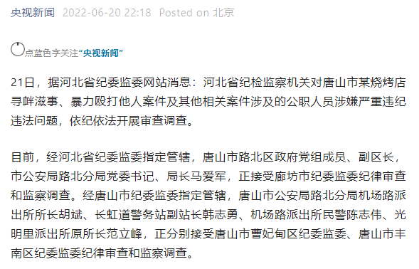 通报唐山打人案所涉及的公职人员违法违纪,新闻还爆出唐山民警曾“谎称报警5分钟后赶到”,然而实际上民众2点41分报警,警察在3点09分才赶到,整整28分钟时间...在央视新闻的第二条通报中,我们还看到:唐山市公安局路北分局局长马爱军等人被查!值得一提的是,机场路派出所民警陈志伟就是当时出警民警,在接受记者采访时称:“在接到报警后5分钟赶到现场”的民警。案件中的施暴者不仅是单纯的聚会,而是在赌博洗钱+密谋世界杯“赌球”。原本,如果只是故意伤害他人导致轻伤二级的话,根据中国《刑法》相关规定,处三年以下有期徒刑、拘役或者管制。也就是说这个人渣可能判不了多少年就会被放出来,但是随着这些信息的曝出—— 案底累累,多次入狱,刑拘在逃,交通事故逃逸,吸毒、失信、开设赌博、不当得利等。如果还酌情考虑“情节严重”、“影响巨大”,“且带有黑社会性质或地方恶势力性质”等因素,应该不会轻判。只是拔出萝卜带出泥,唐山这次的“大地震还远没有结束。在此次事件发生后的几天,网上手持身份证实名举报的人如雨后春笋般冒出,唐山公安局被上访之人围的人泄不通。就连三名唐山交警都实名举报唐山检察院检察长。大家不禁疑问:唐山这是怎么了?希望借这次事件真正连根拔起唐山恶势力背后的“保护伞”、“大老虎”。也真的希望唐山的雷霆行动,不止是一时的表演,而是落到实处,真正以铁腕除暴,以行动安良。