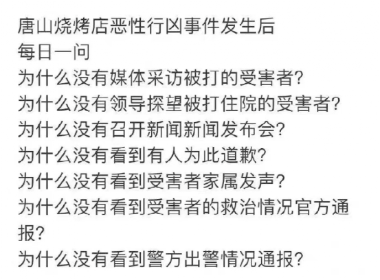 今天距离唐山烧烤店暴力侵害案已经过去了足足10天,大家都在关注着四名唐山受害女生的近况,期盼四位女子中的伤者能够得到有效治疗,有关伤情能公之于众,女子从当事者的角度还原事件始末,推动案情调查及后续处理。可是大家左等右等,一直没等到受害女子的进一步消息。公众和媒体所能获取的相关信息极其有限。
