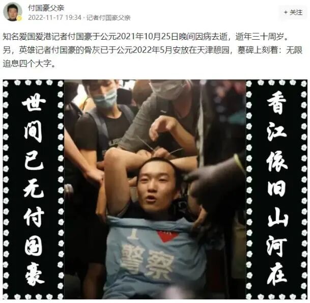 17日晚间,环球时报原记者付国豪的父亲通过社交网络发布消息:“知名爱国爱港记者付国豪于公元2021年10月25日晚间因病去逝,逝年三十周岁。另,英雄记者付国豪的骨灰已于公元2022年5月安放在天津憩园,墓碑上刻着“无限追息”四个大字。”澎湃新闻联系到付国豪多位亲友,已确认:付国豪于去年(2021年)10月去世,安葬在家乡天津。凤凰网新闻记者联系到了付国豪父亲,付国豪父亲说:“孩子离职后,我们一家人陪他和抑郁症抗争,但在2021年10月他还是离开了我们,追思会目前尚未确定是否办理。”回忆起儿子,付国豪父亲情绪激动,他告诉记者:“付国豪大学毕业到北京从事记者,3年的时间里,一路上经历了很多,付出了很多,他是个很宽厚的男孩。”官方资料显示,付国豪1991年在天津出生,毕业于中国海洋大学文学与新闻传播学院新闻学专业。2019年8月14日,环球时报/环球网记者付国豪在香港国际机场被暴力示威者包围袭击和捆绑。当时付国豪喊出:“我支持香港警察,你们可以打我了。”8月14日凌晨,人民日报发表名为《付国豪,真汉子!》的文章,称“8月14日12:20,付国豪已出院,接受记者采访时,他表示幸运、没受致命伤,依然爱香港!”康复后的付国豪受到了英雄般的礼遇。他很快回归正常工作,并刻意保持低调。2019年9月,环时内部召开“香港报导表彰会”,付国豪获得10万人民币奖金。