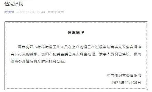据极目新闻称,疑因是湖南浏阳一小区业主在业主群对工作提出建议,被街道干部上门殴打。另有网传,湖南长沙浏阳市水岸山城三期的一位业主在业主群里求助,称自己因为在业主群里提了不同意见,就被街道办事处治安综合治理办事处主任廖某和三位民警强行闯入家中,交谈过程中对方还殴打了自己老公。事情的起因是前两天因为物业要封掉小区的几个出口,这位业主在业主群里提意见认为此做法不妥,要求保留出口,可以派人查验双码即可。留言后并没有人回应。结果到了第二天,浏阳市荷花街道的社会治安综合治理办主任廖某,带领三位民警强行闯入家中,称他们发布反动言论,老公在辩解过程中,廖某直接把自己老公按在沙发上殴打。截止目前,到底是因为什么争吵,没有得到官方证实。但这条被疯传的视频,已得到浏阳官方证实——确实是街道干部殴打了业主。针对此事,浏阳市公安局已经进行立案查处。浏阳市纪委工作人员称,目前纪委和相关部门已经介入此事,涉事人员现已停职,官方肯定会给一个公平公正的处理结果。据微信公号“微浏阳”11月30日消息,中共浏阳市委宣传部发布情况通报,全文如下: